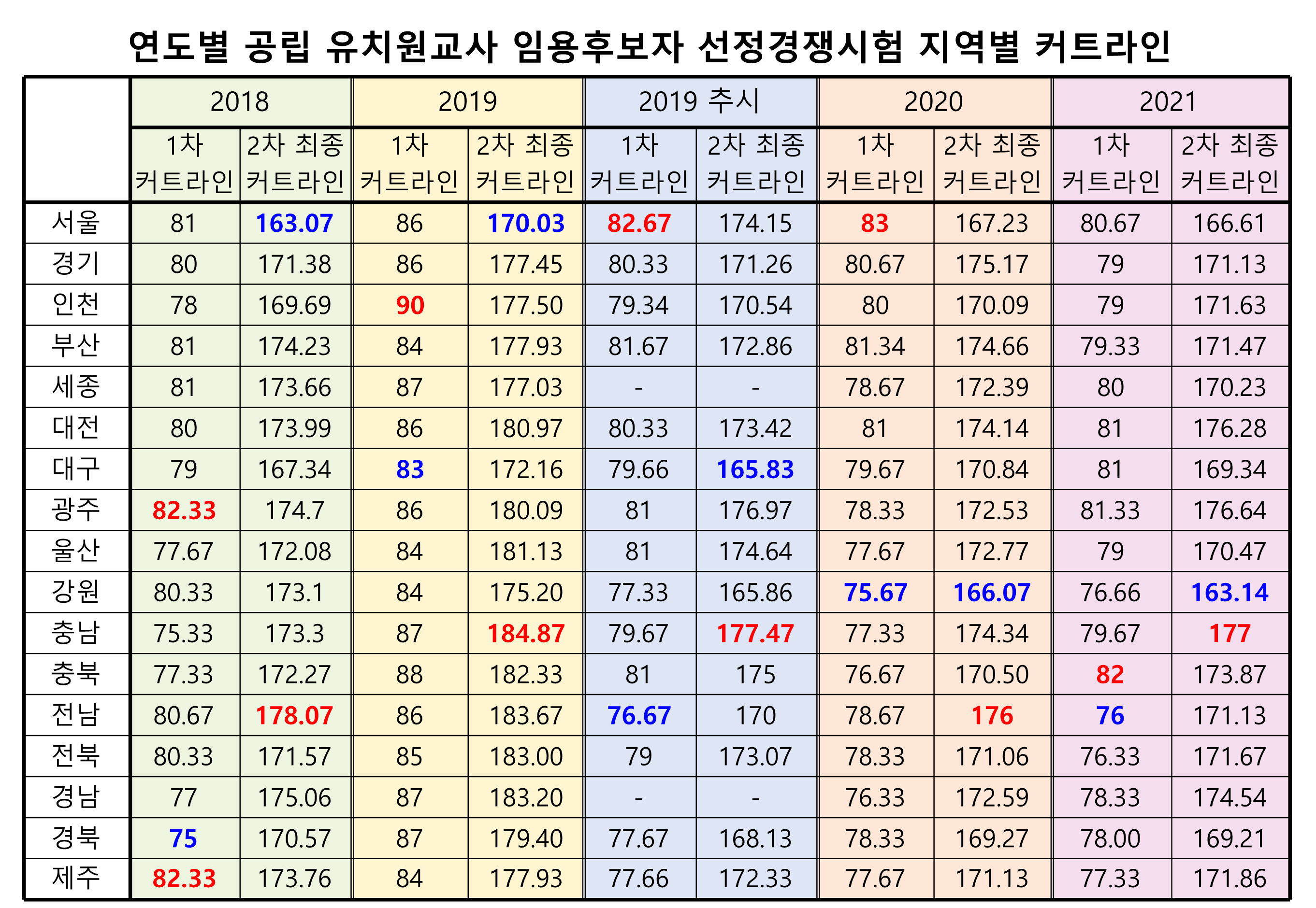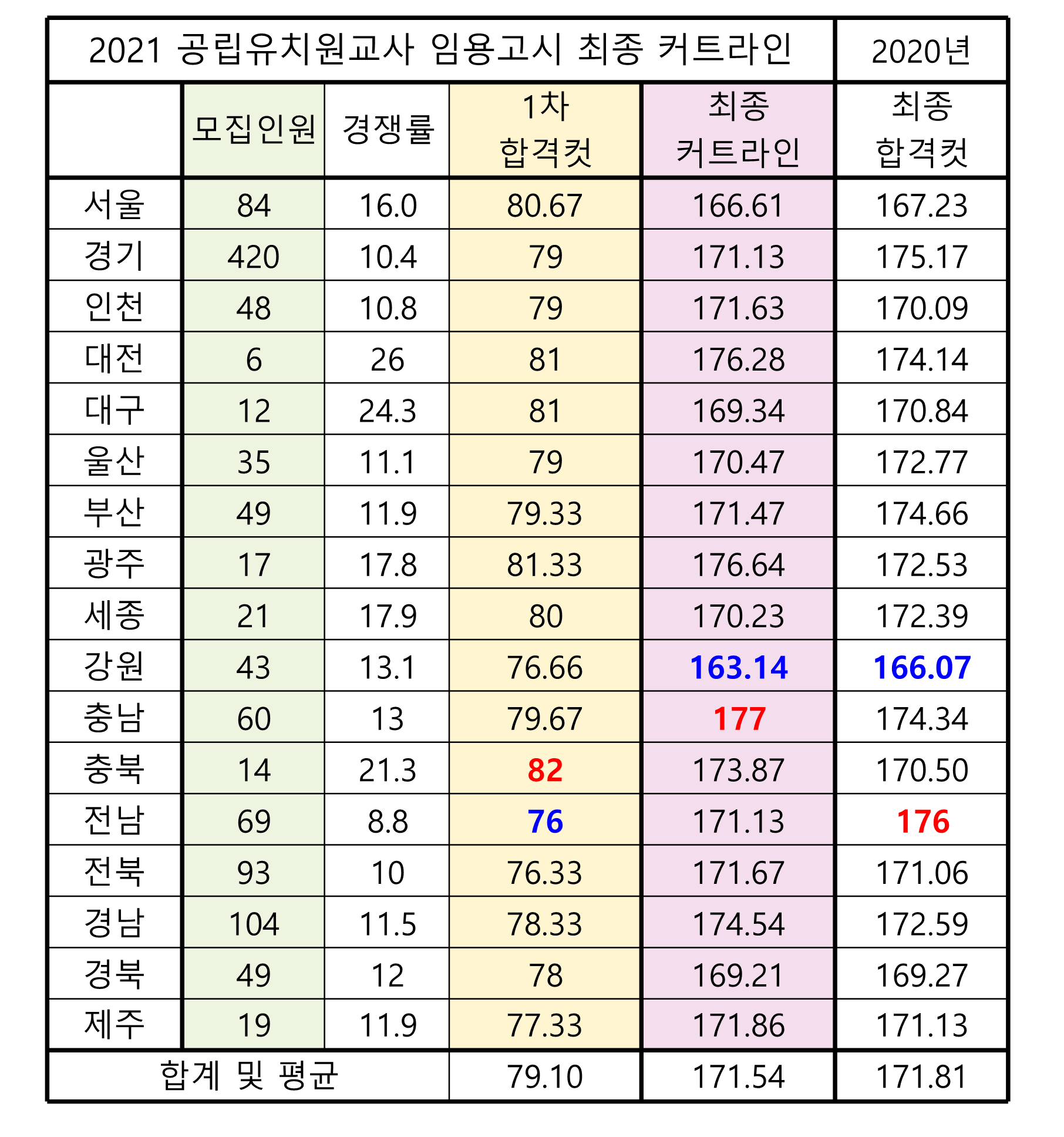 2021학년도 공립유치원교사 임용고시 최종 커트라인